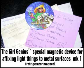 All items feature the Girl Genius logo. 2002 [CaféPress] $18.99 T-Shirt {Ash Grey} 2002 [CaféPress] $18.99 Women's T-Shirt 2002 [CaféPress] $12.99 Toddler's T-Shirt 2002 [CaféPress] $26.95 Sweatshirt 2002 [CaféPress] $15.99 Tote Bag 2002 [CaféPress] $14.99 Cap 2002 [CaféPress] $10.99 Mug 2002 [CaféPress] $12.99 Large Mug 2002 [CaféPress] $12.99 Mousepad |